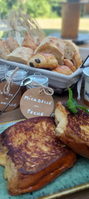 Confectionnés à partir de produits « maison » et /ou de producteurs locaux, viennoiseries, pain, jus de fruits, boissons chaudes de votre choix (café, thé, chocolat chaud…), confiture et autres gourmandises à découvrir.
